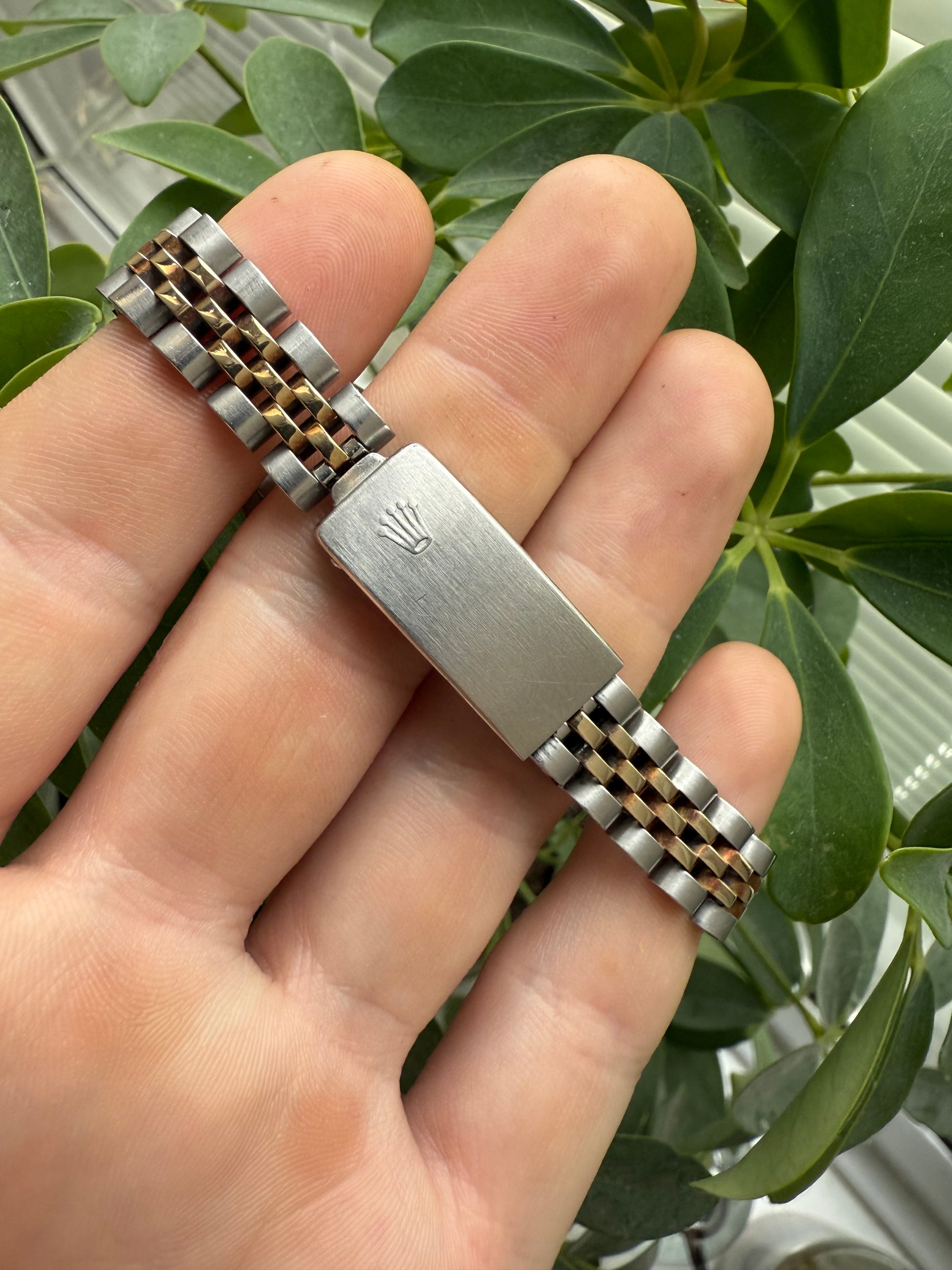 Featuring a stunning golden dial with baton indexes, The watch has a stainless steel and 18k yellow gold jubilee bracelet with a width of 13mm, the oyster case is made of rolexes premium steel and has fluted 18k gold bezel.