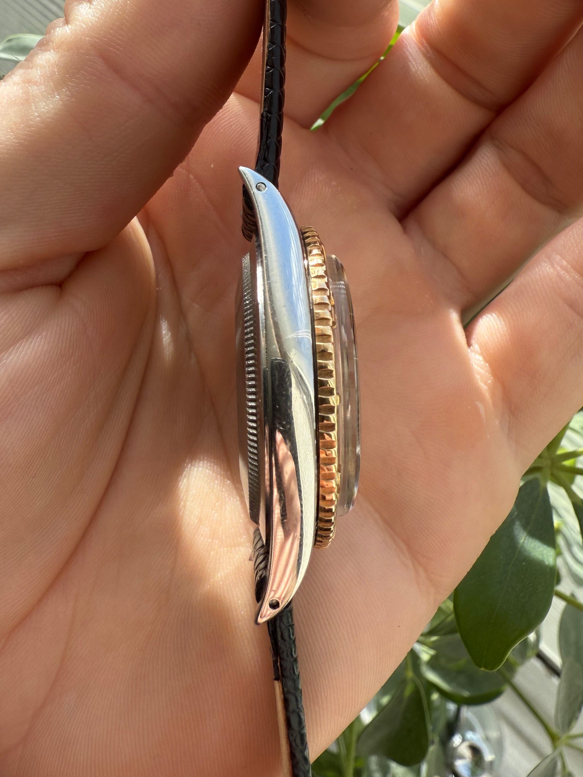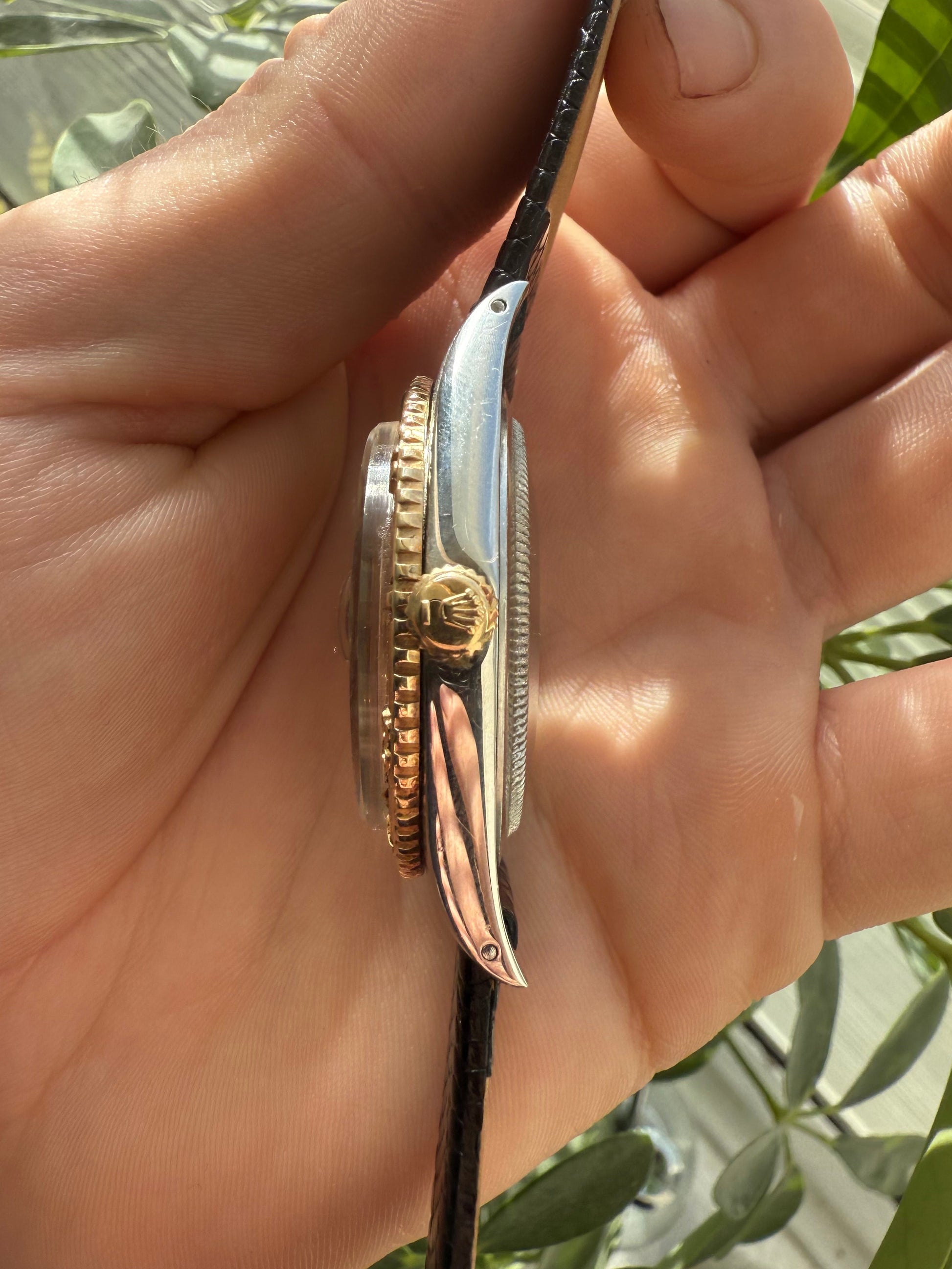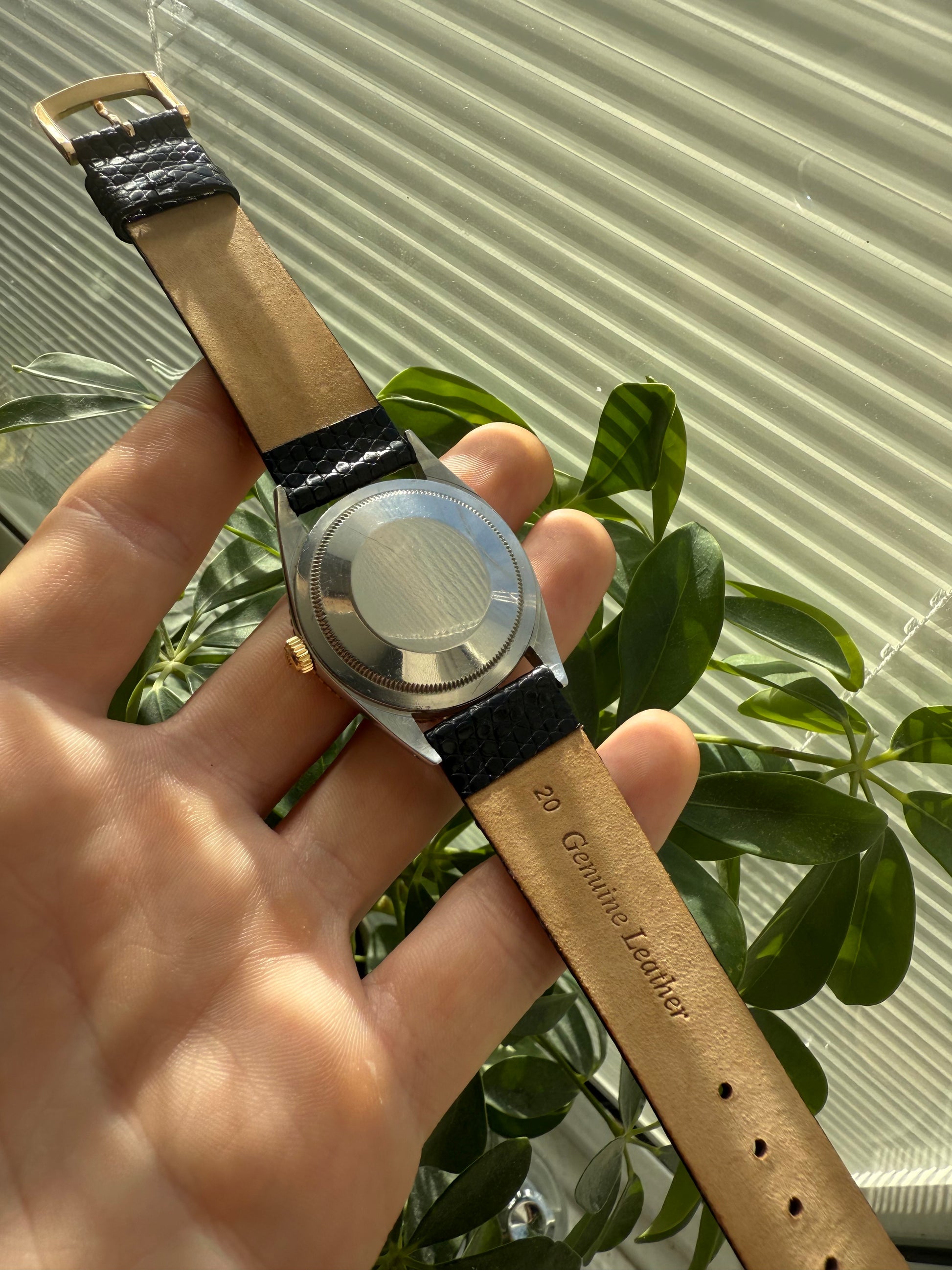 Featuring a stunning silver dial with gold baton indexes, The watch has a generic leather replacement strap with a width of 20mm, the oyster case is made of rolexes premium steel and has rotating 18k yellow gold bezel.